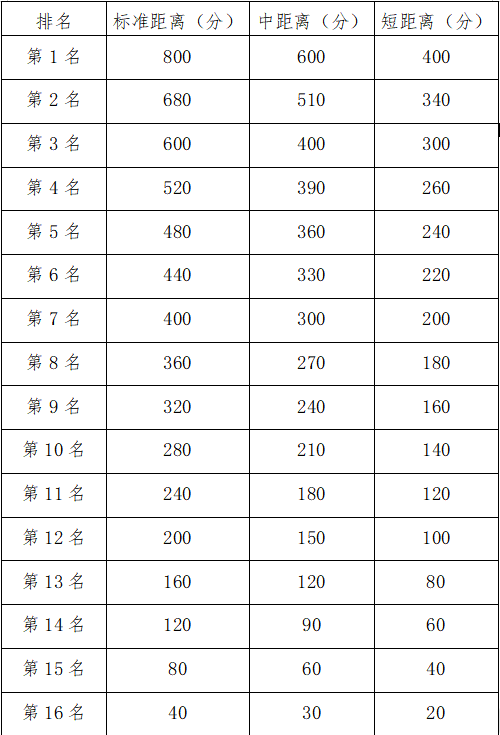 4.参加以上任意竞赛项目并获得前16名,将获得该项目的排名积分,总决赛积分翻倍。具体分值如下: